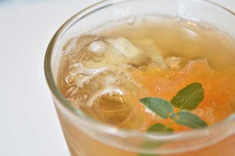 食後のドリンクにスモモのゼリーのティーソーダ。