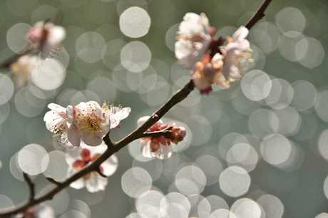 上の写真は円形絞りなので丸いボケになる。