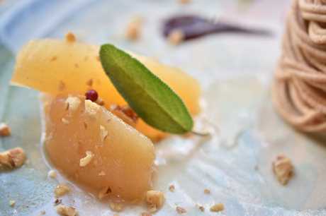 脇を固めるように洋ナシのコンポート。
