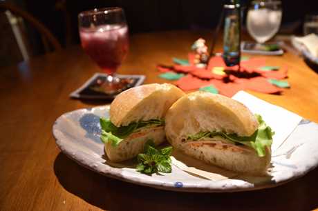 鶏レバーのパテパクチーなどが挟まれている。
